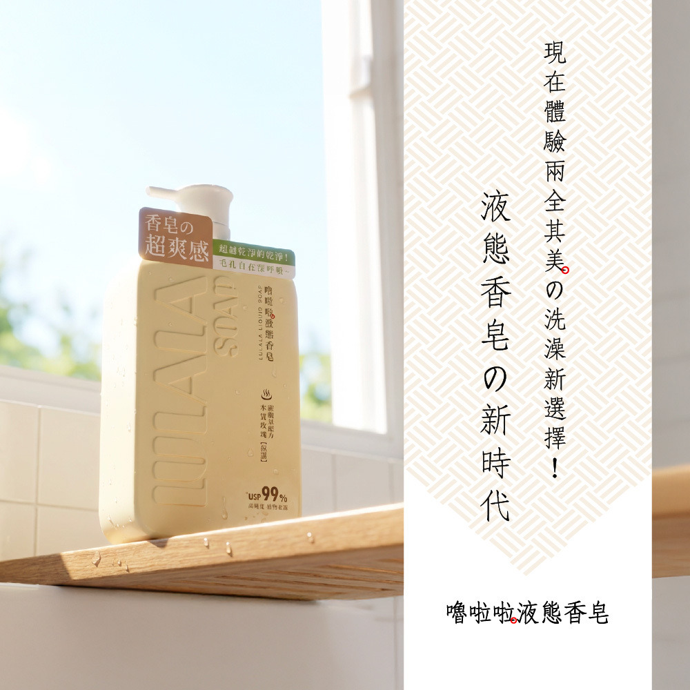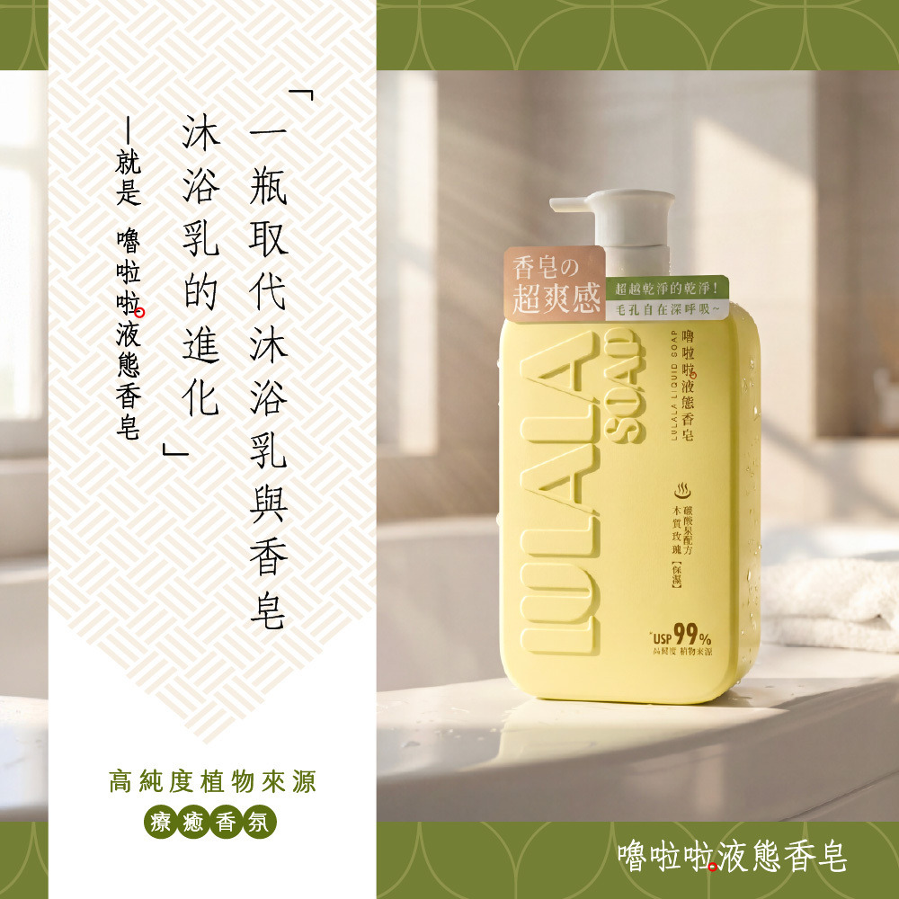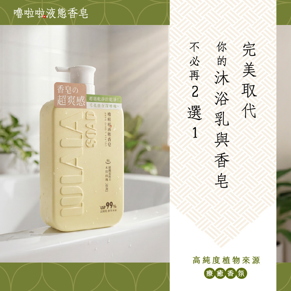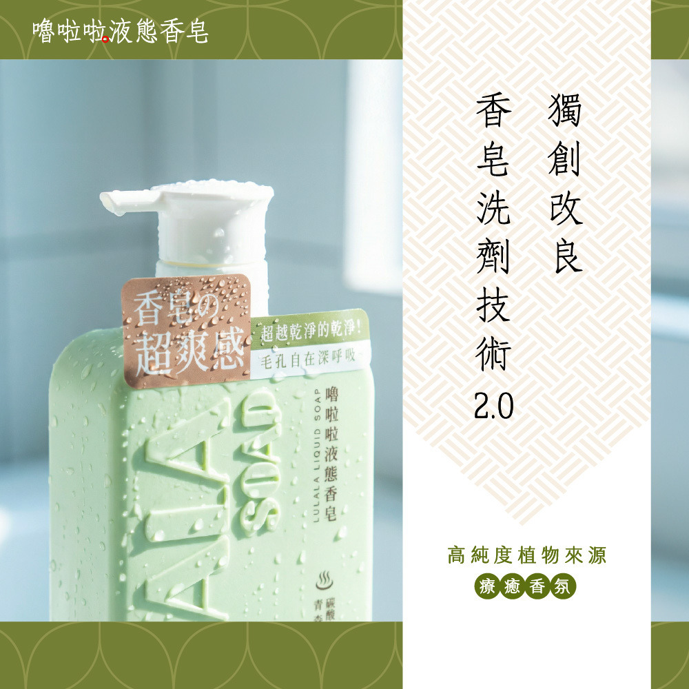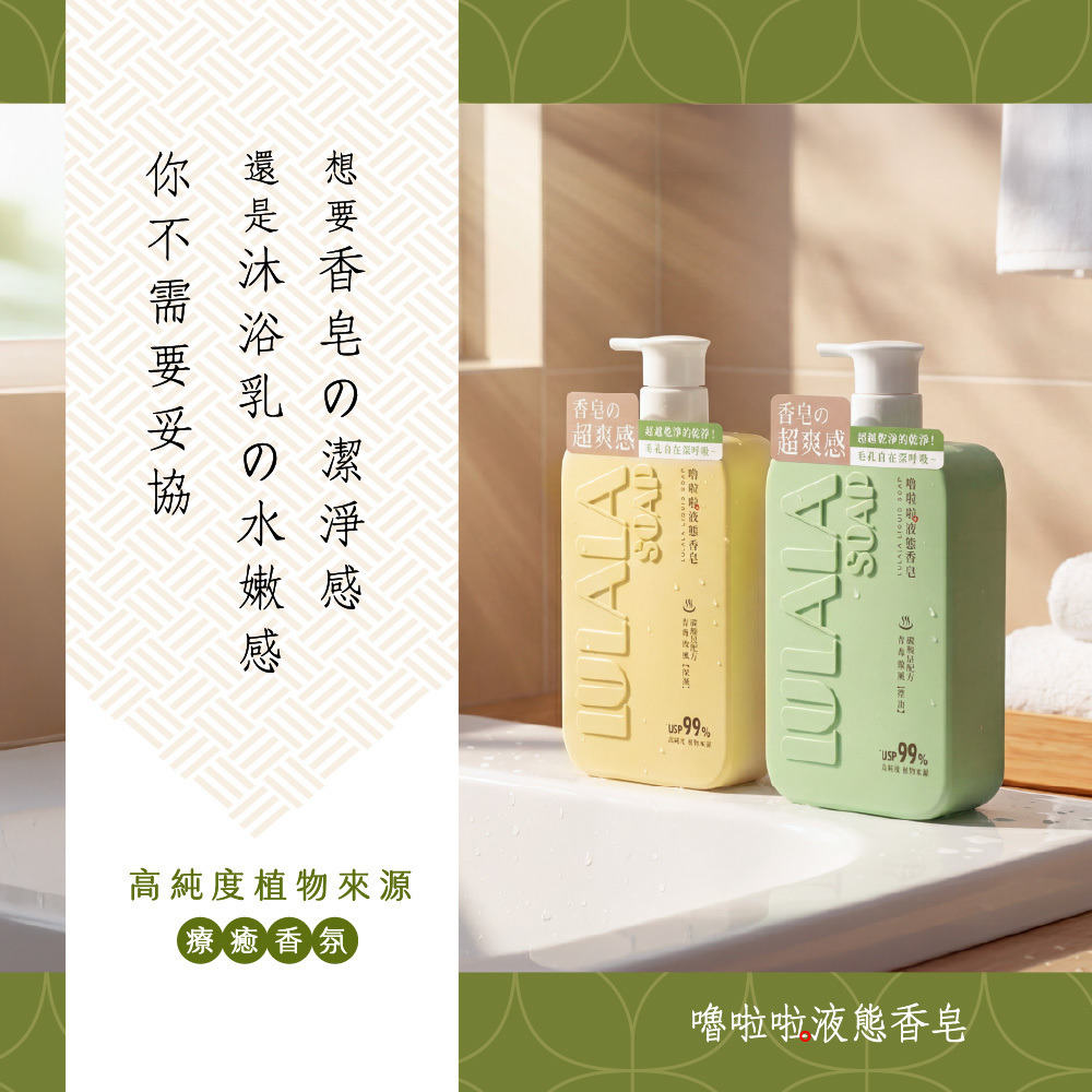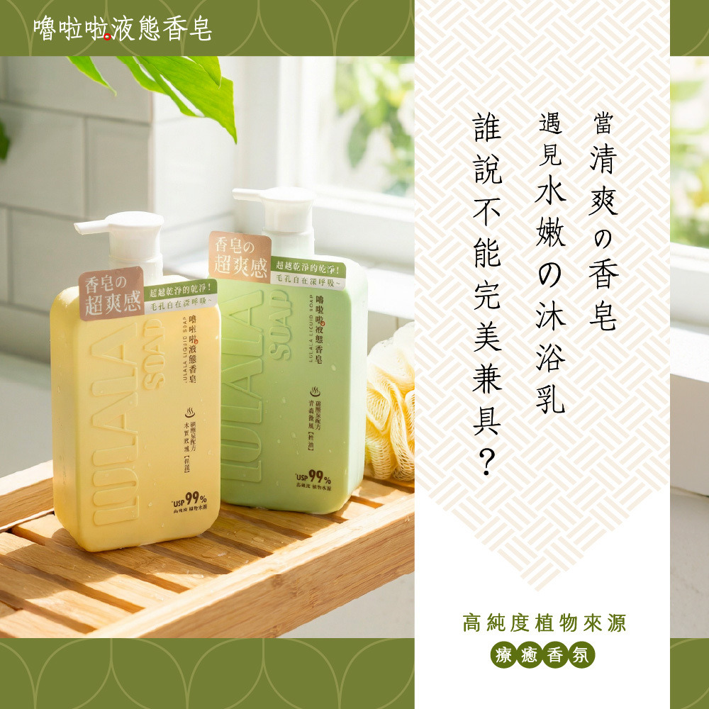 洗出香皂的潔淨感,留下沐浴乳的水嫩感。完美取代你的沐浴乳與香皂!就選嚕啦啦液態香皂