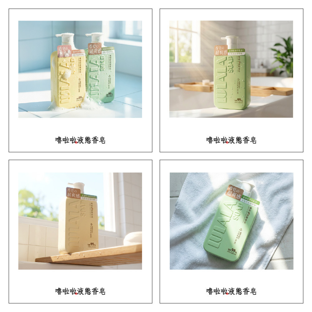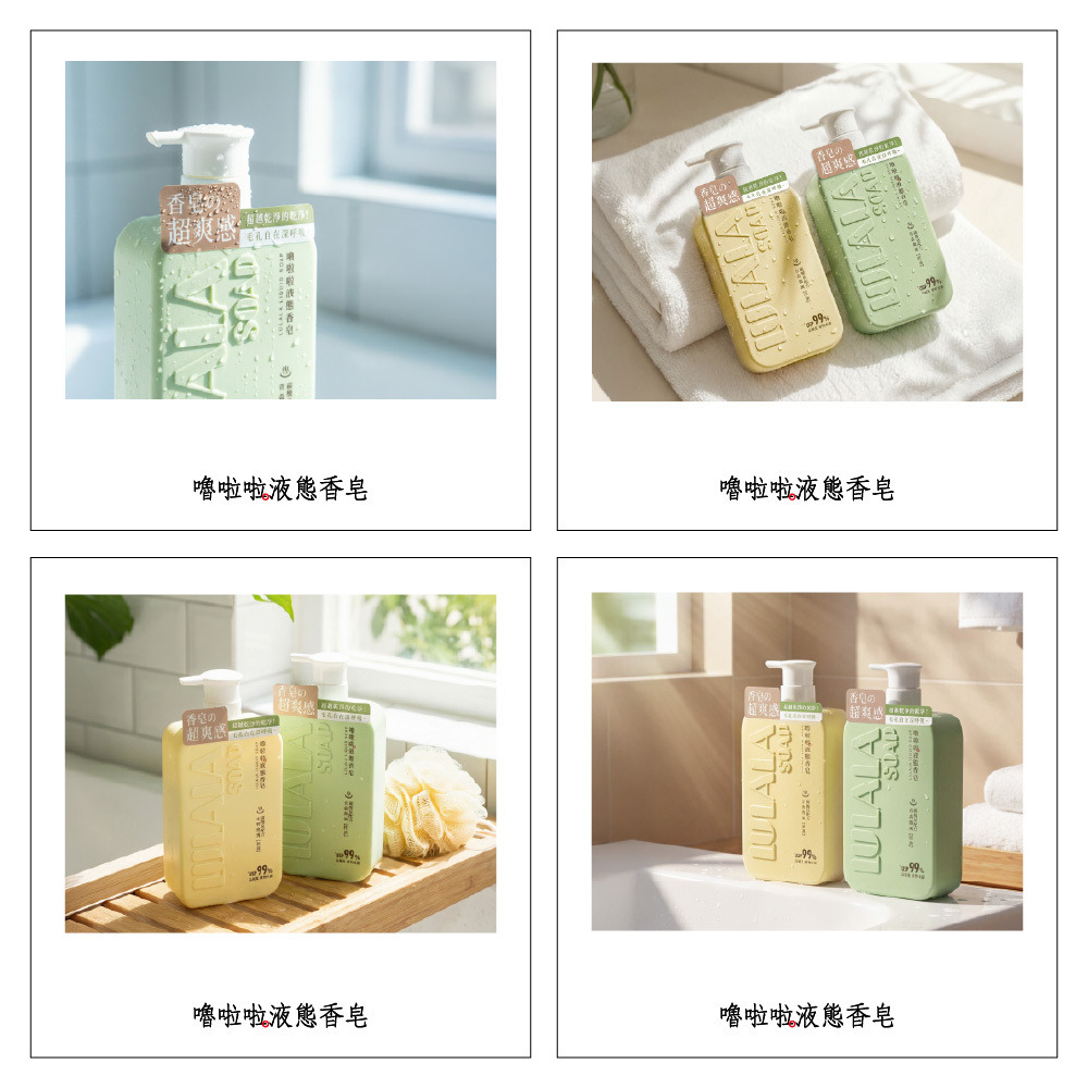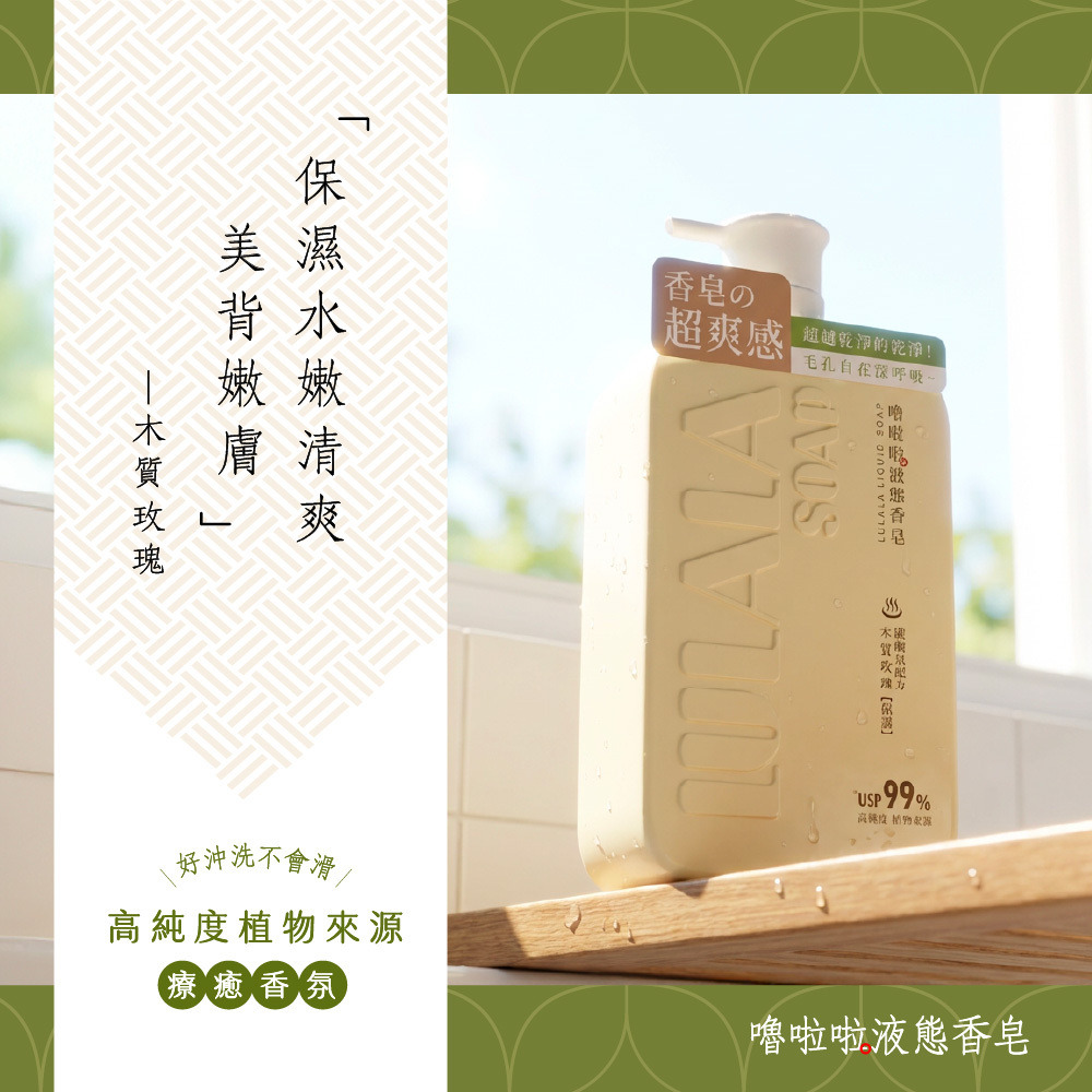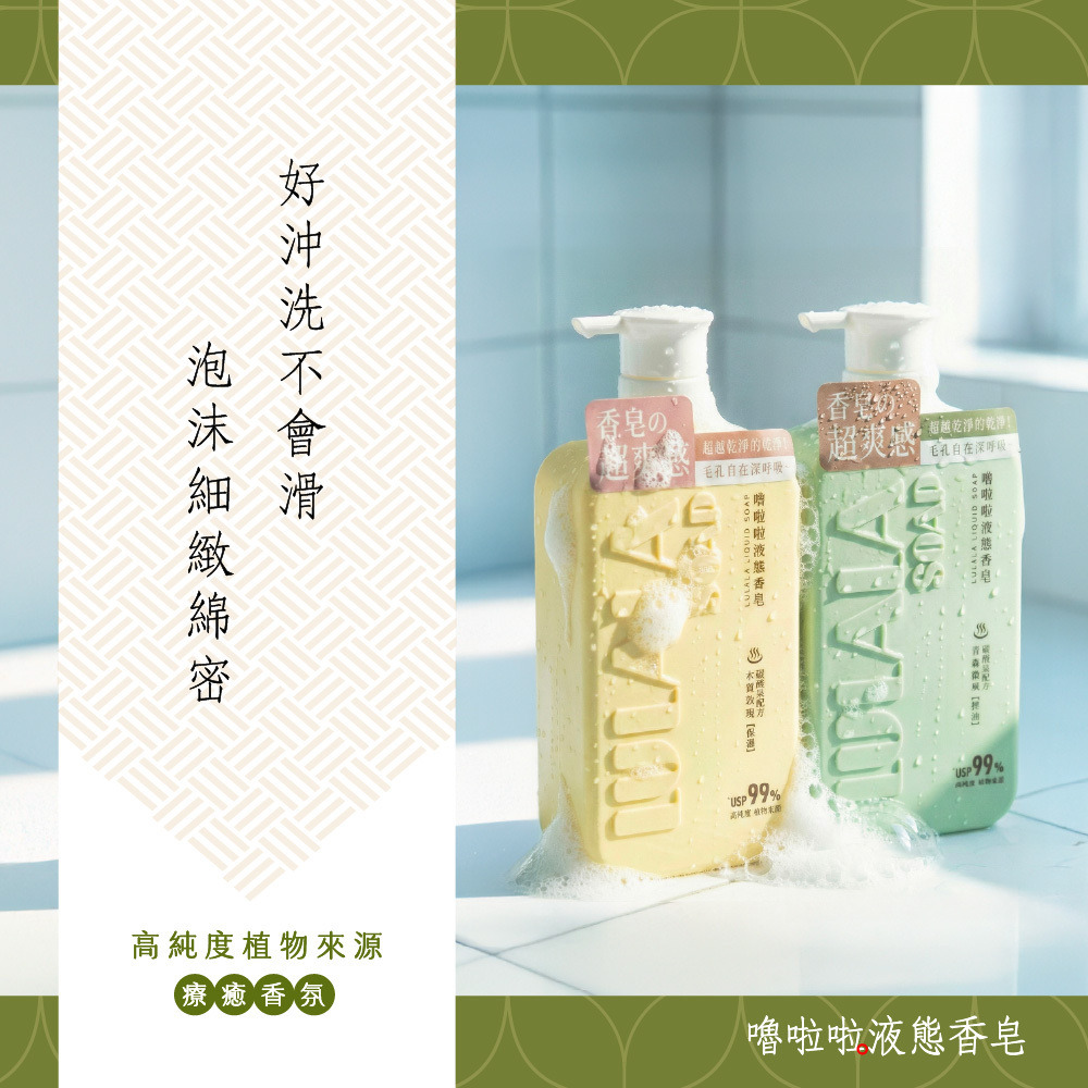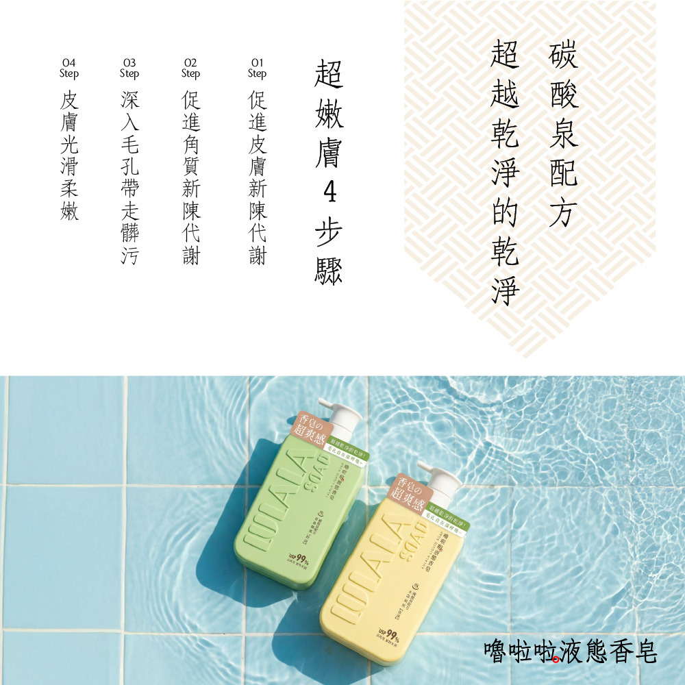 洗出香皂的潔淨感,留下沐浴乳的水嫩感。完美取代你的沐浴乳與香皂!就選嚕啦啦液態香皂