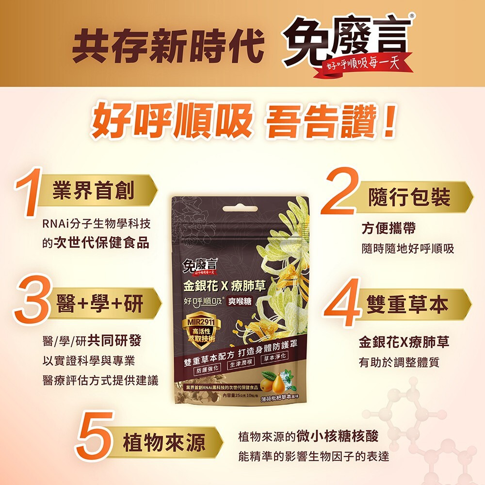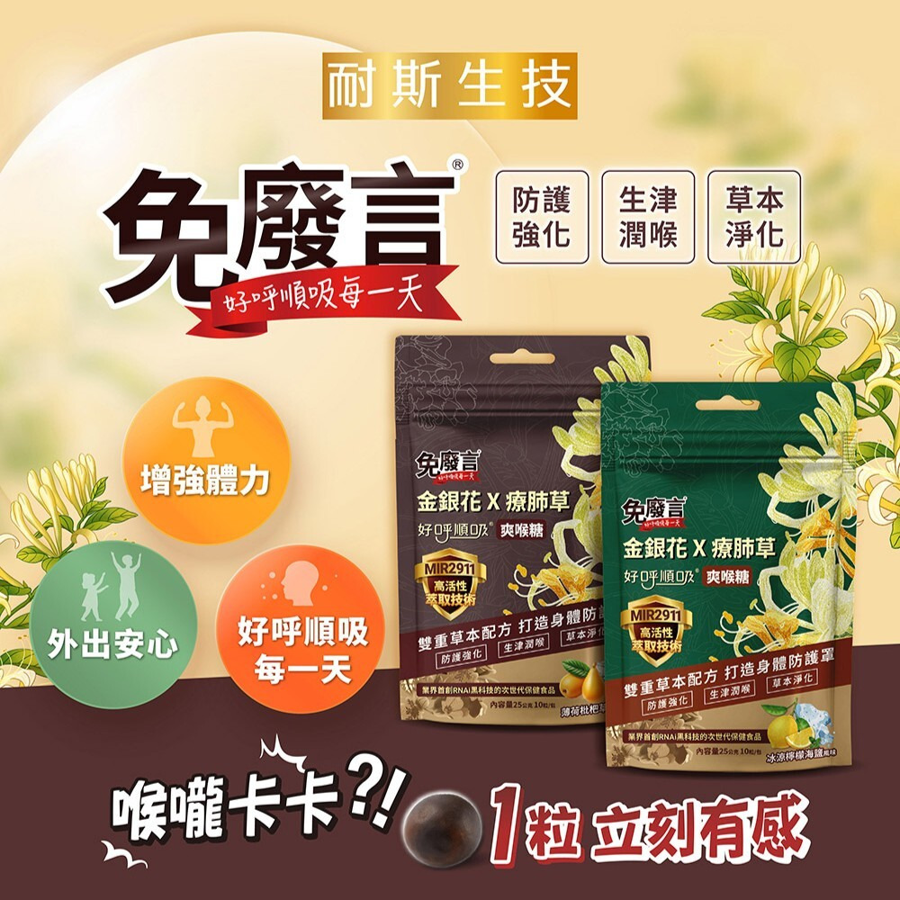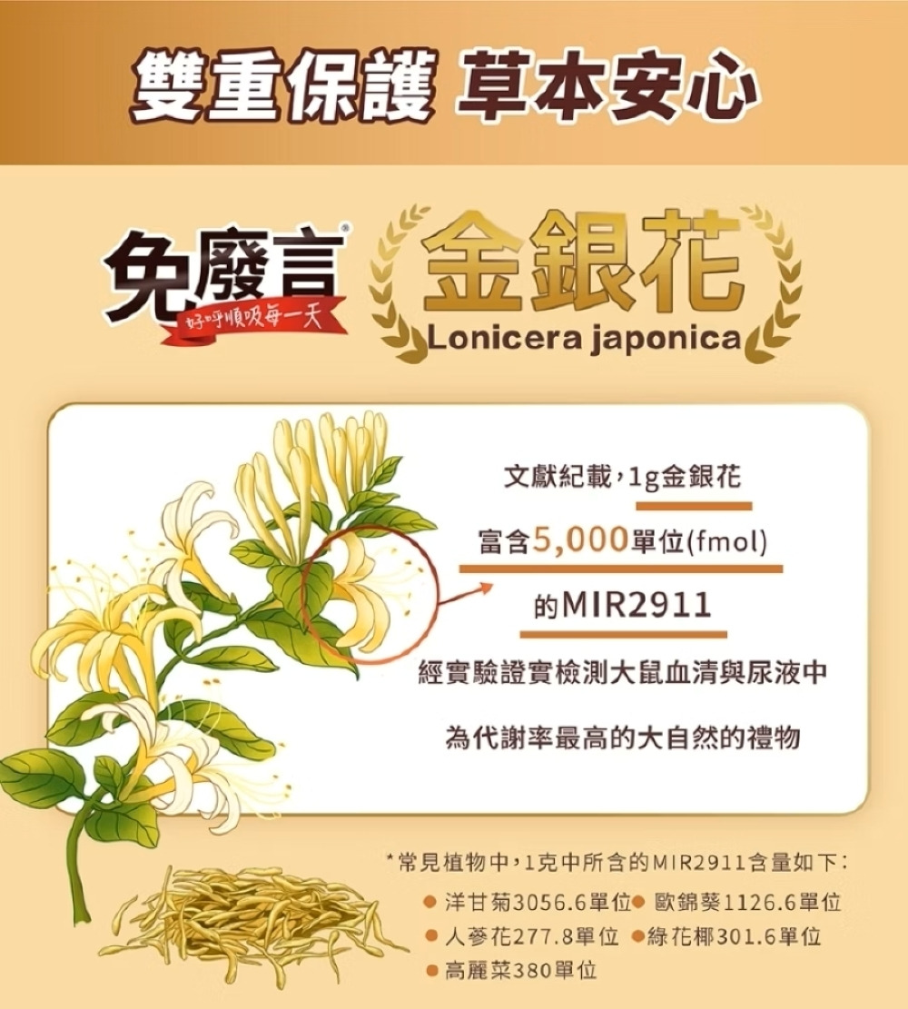 【注意事項】1.本產品含有金銀花,蠶豆症患者不宜食用。2.本產品請置於兒童無法取得處,請大人留意避免3歲以下幼童因吞食不當而噎食。